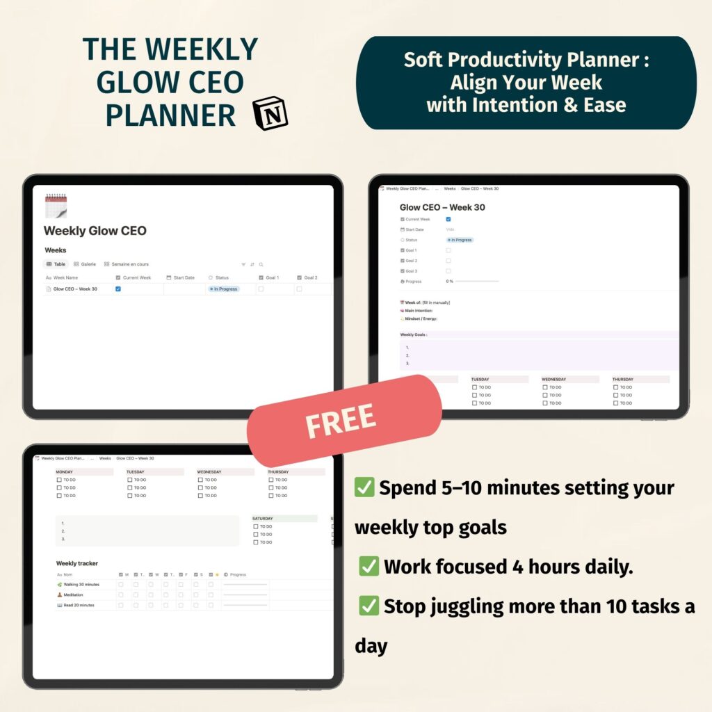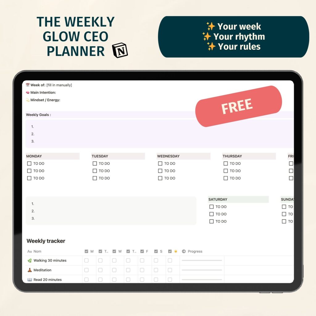 Le Weekly Glow CEO Planner est un template Notion simple mais puissant, conçu pour les entrepreneures qui jonglent entre créativité et action.